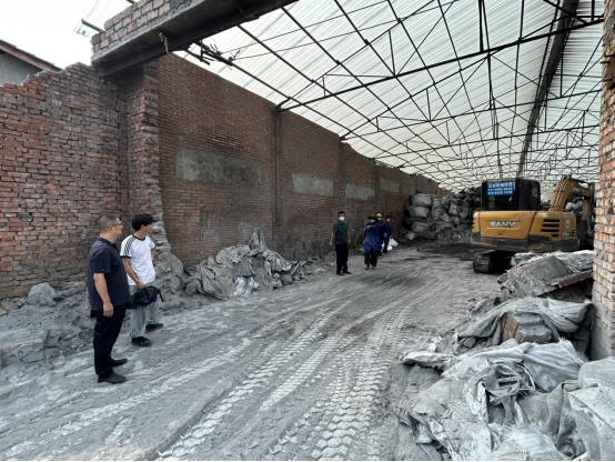 (图片为审计组现场检查马村镇其云陶瓷厂厂房堆放铝灰处理情况)