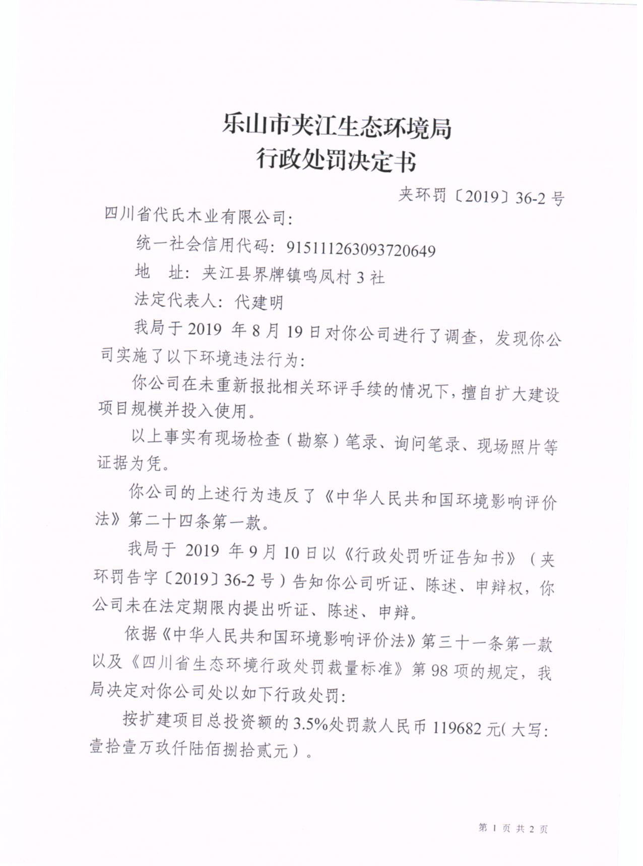 四川省代氏木业有限公司行政处罚决定书