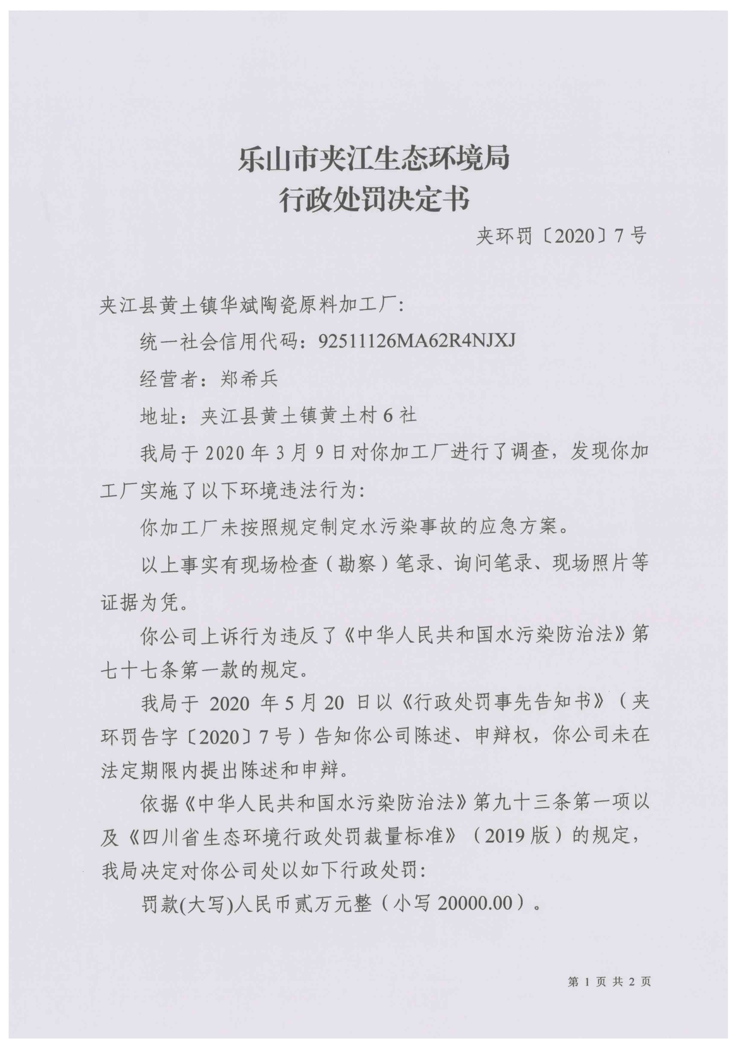 夹江县黄土镇华斌陶瓷原料加工厂行政处罚决定书