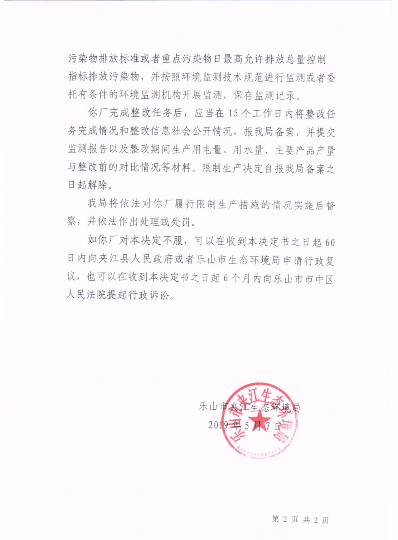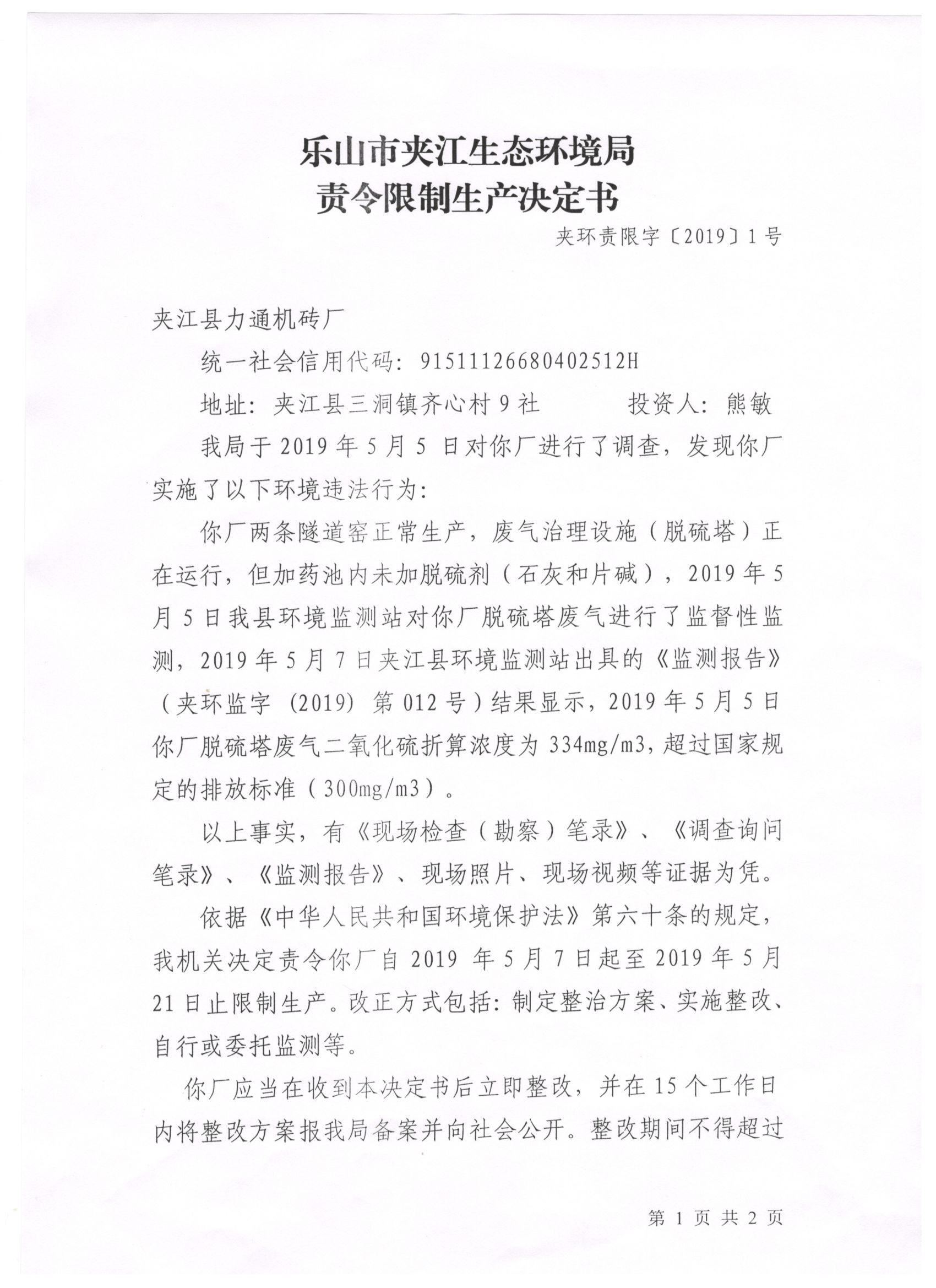 夹江县力通机砖厂责令限制生产决定书