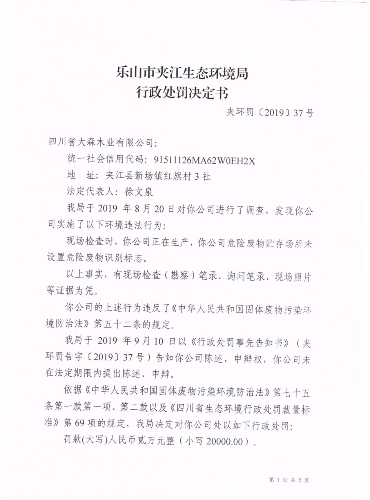 四川省大森木业有限公司行政处罚决定书