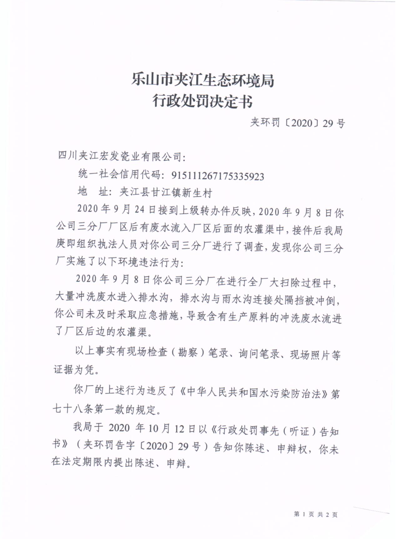 四川夹江宏发瓷业有限公司行政处罚决定书