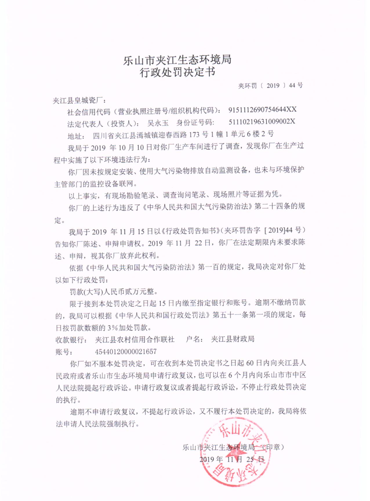 夹江县皇城瓷厂行政处罚决定书