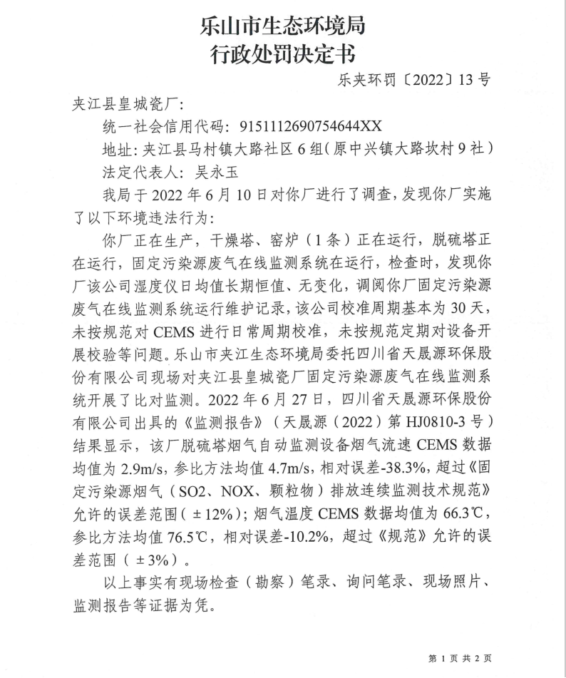 夹江县皇城瓷厂行政处罚决定书