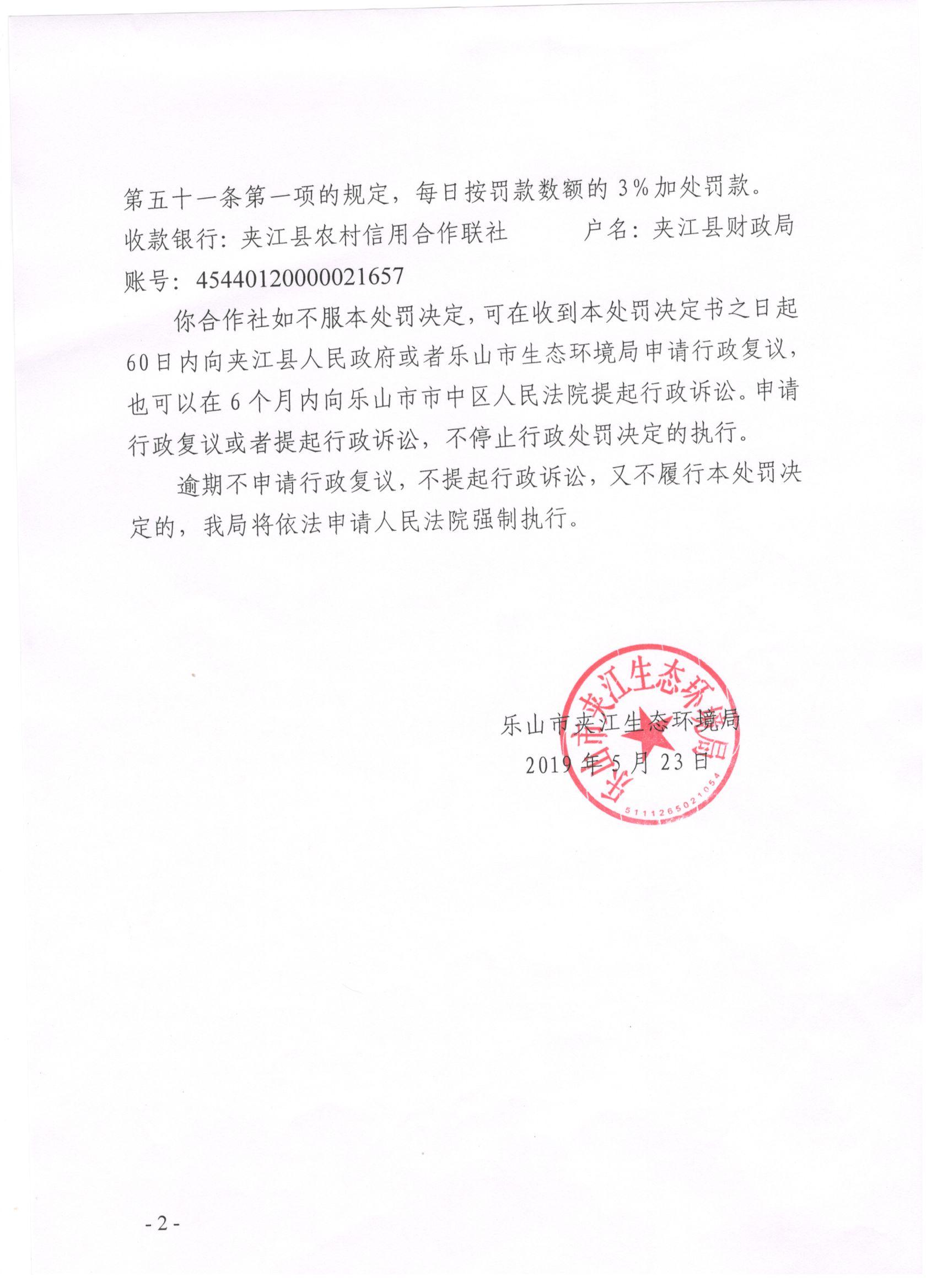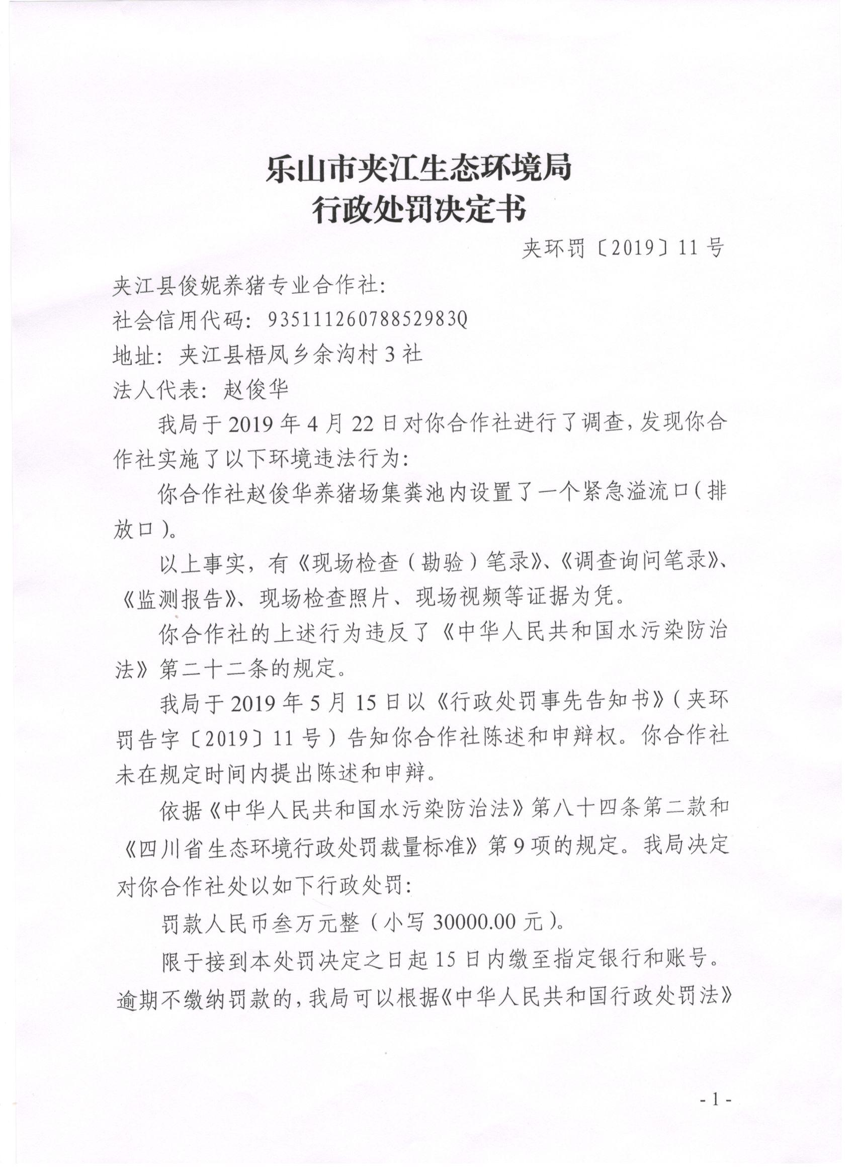 夹江县俊妮养猪专业合作社行政处罚决定书