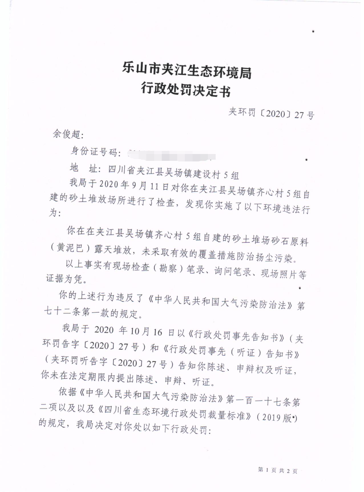 余俊超行政处罚决定书
