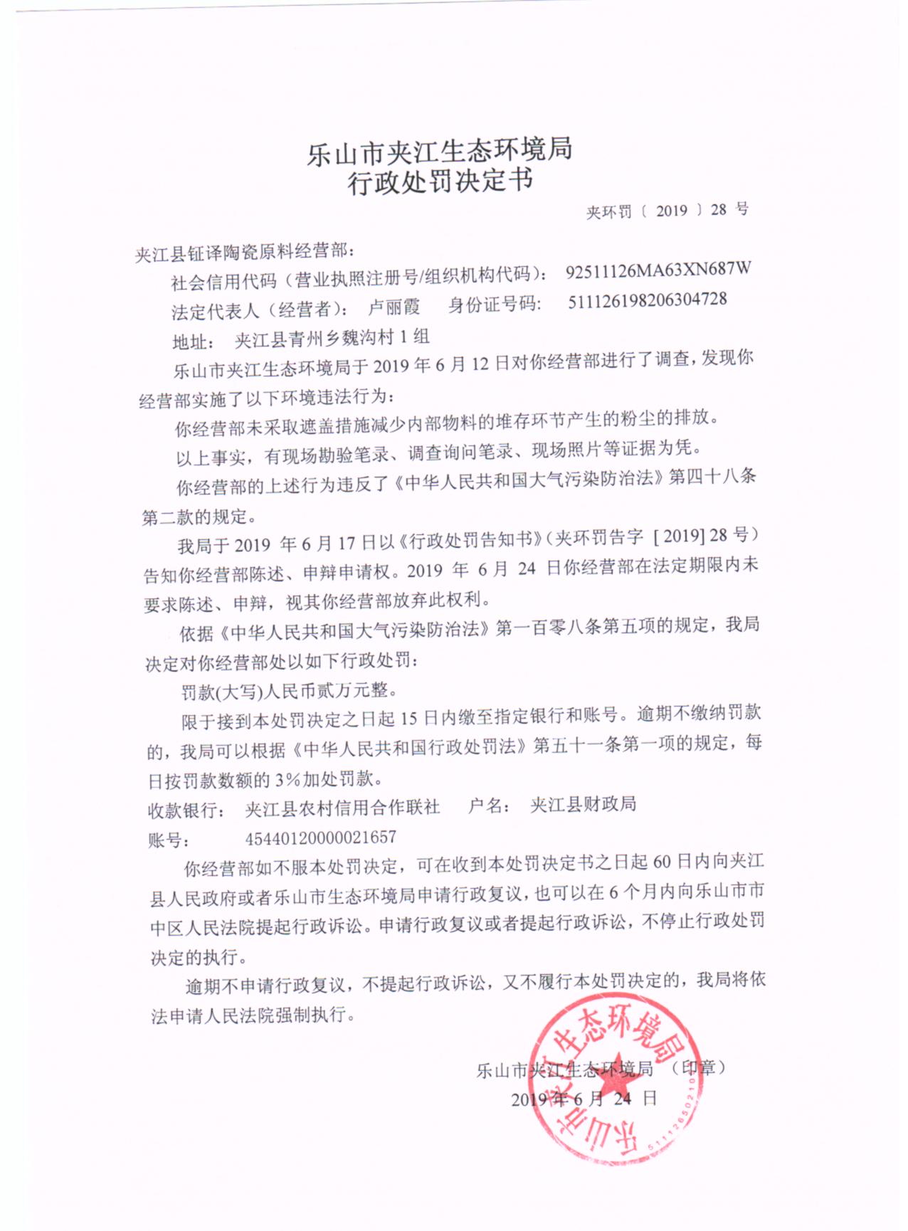 夹江县钲译陶瓷原料经营部行政处罚决定书