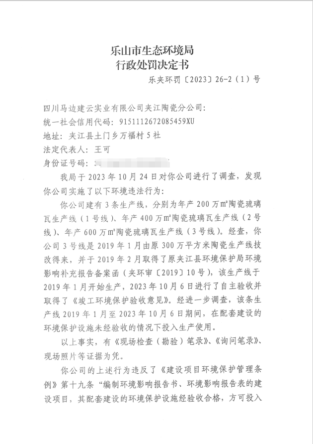 四川马边建云实业有限公司夹江陶瓷分公司行政处罚决定书
