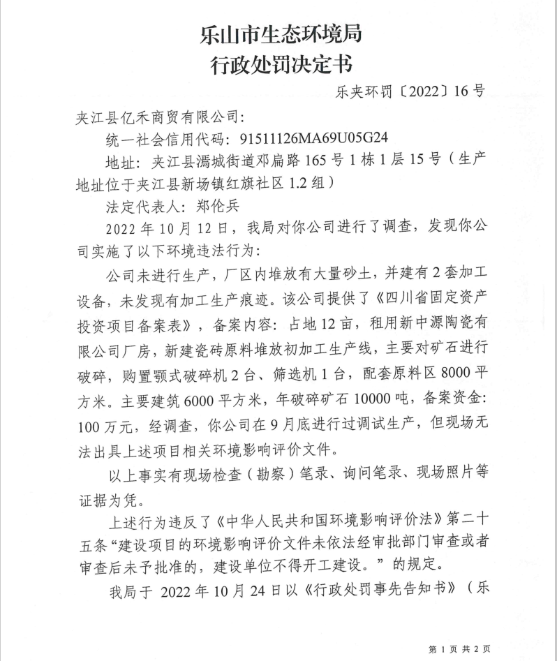 夹江县亿禾商贸有限公司行政处罚决定书