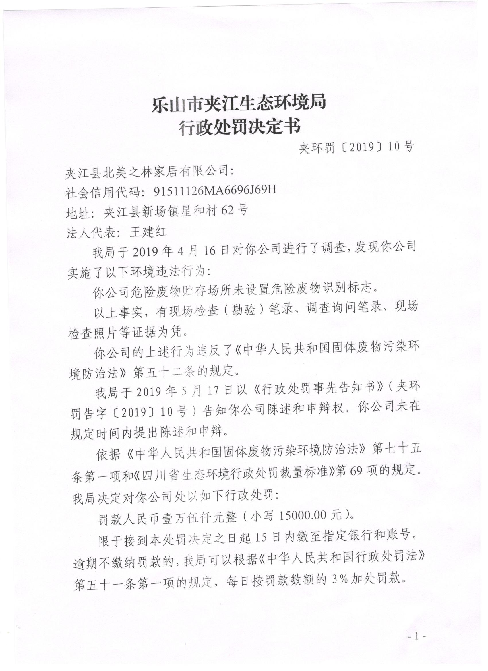 夹江县北美之林家居有限公司行政处罚决定书