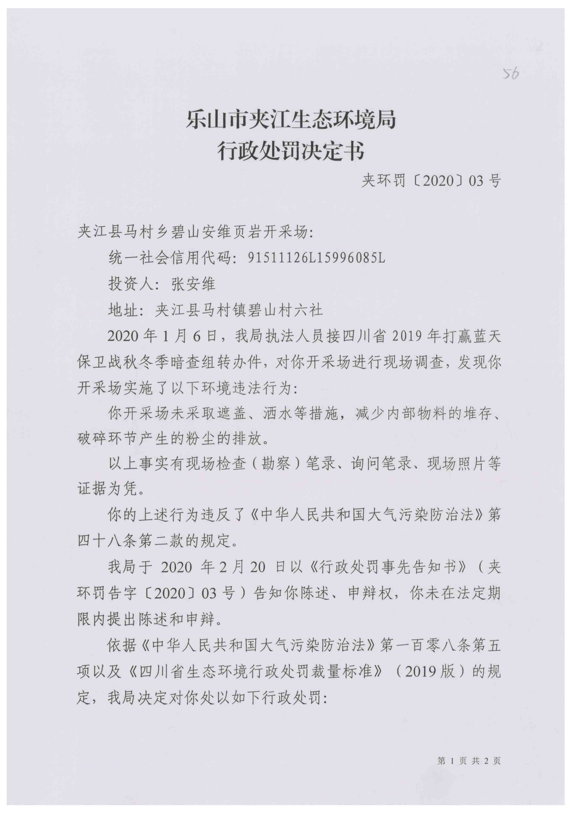 夹江县马村乡碧山安维页岩开采场行政处罚决定书