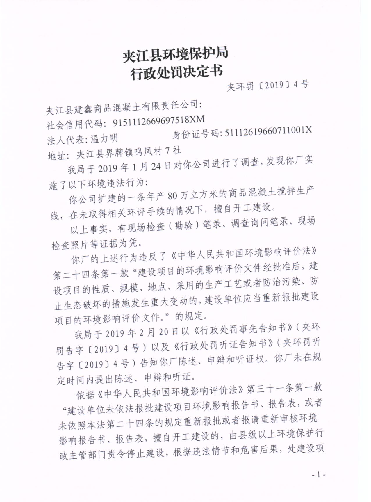 夹江县建鑫商品混凝土责任有限公司行政处罚决定书
