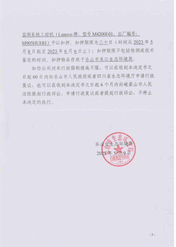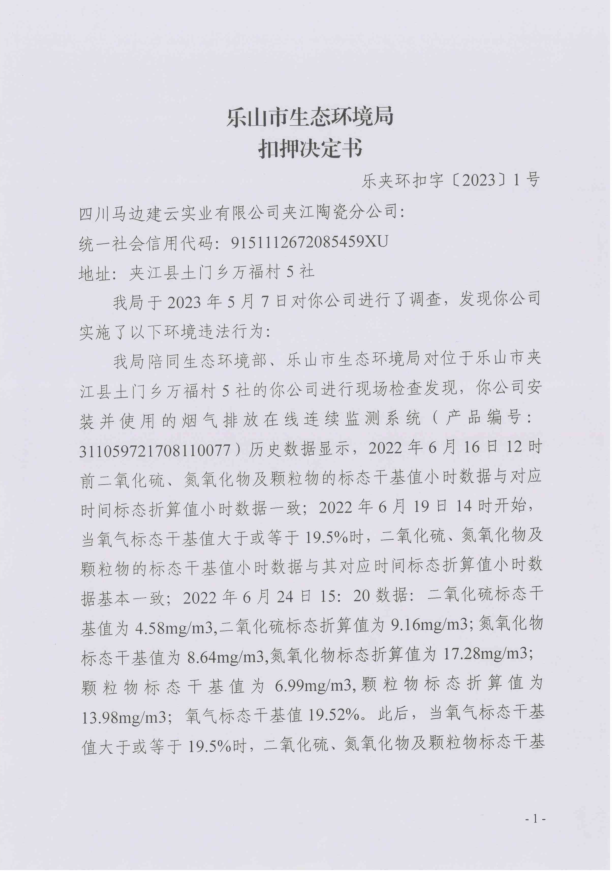 四川马边建云实业有限公司夹江陶瓷分公司扣押决定书