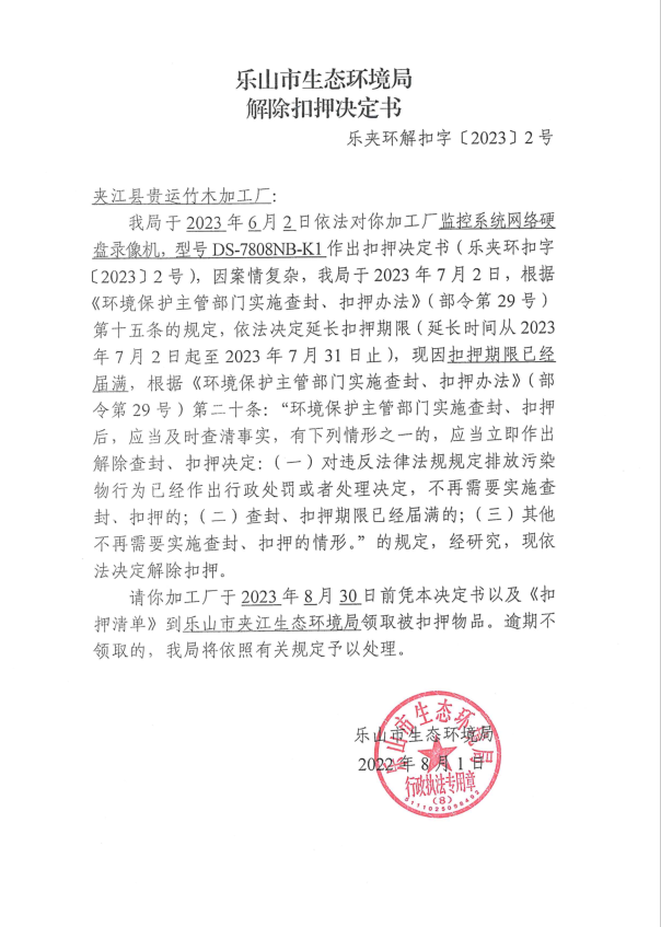 夹江县贵运竹木加工厂解除扣押决定书