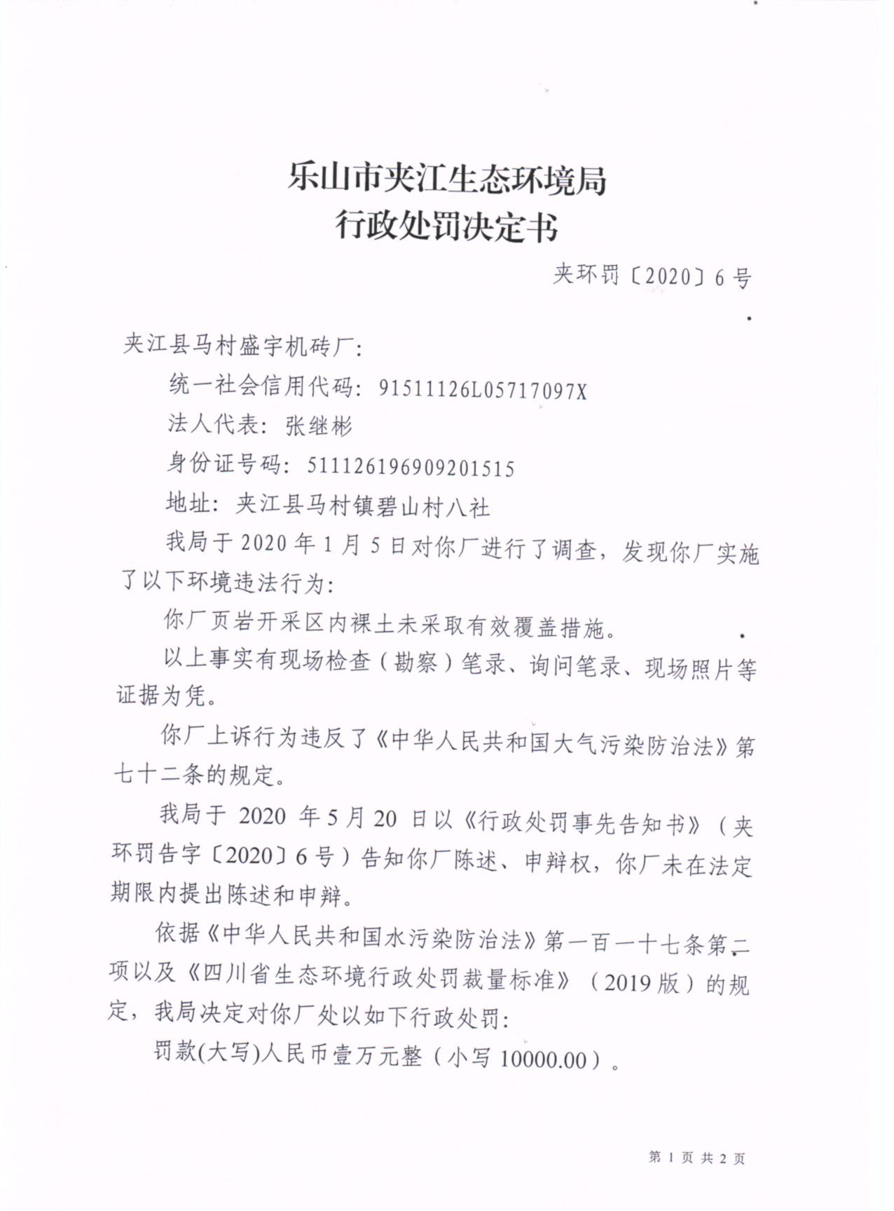 夹江县马村盛宇机砖厂行政处罚决定书