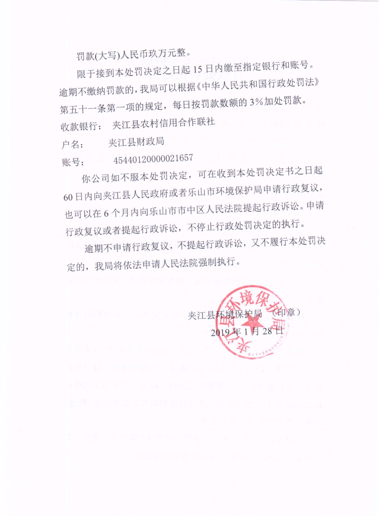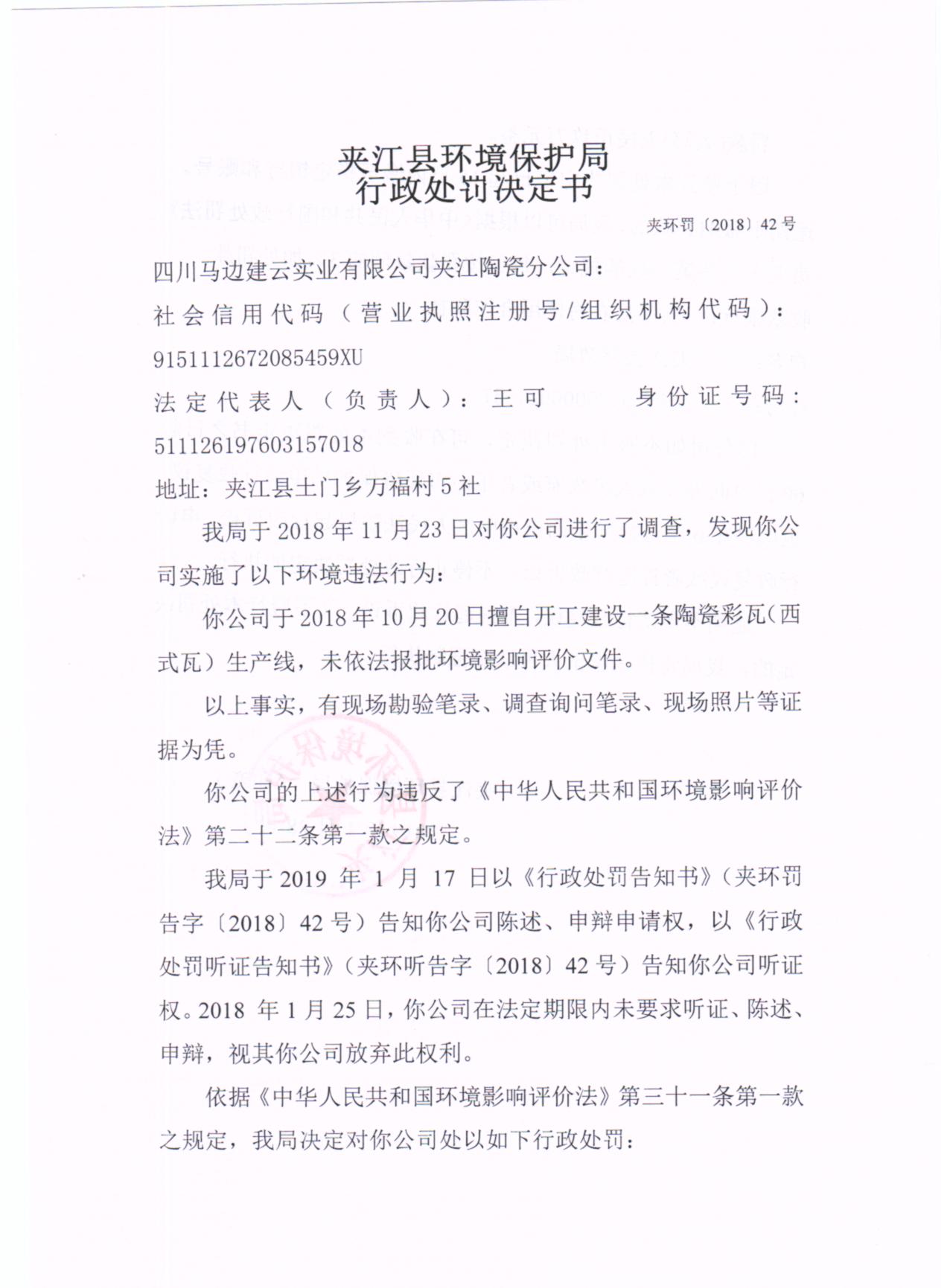 四川马边建云实业有限公司夹江陶瓷分公司行政处罚决定书
