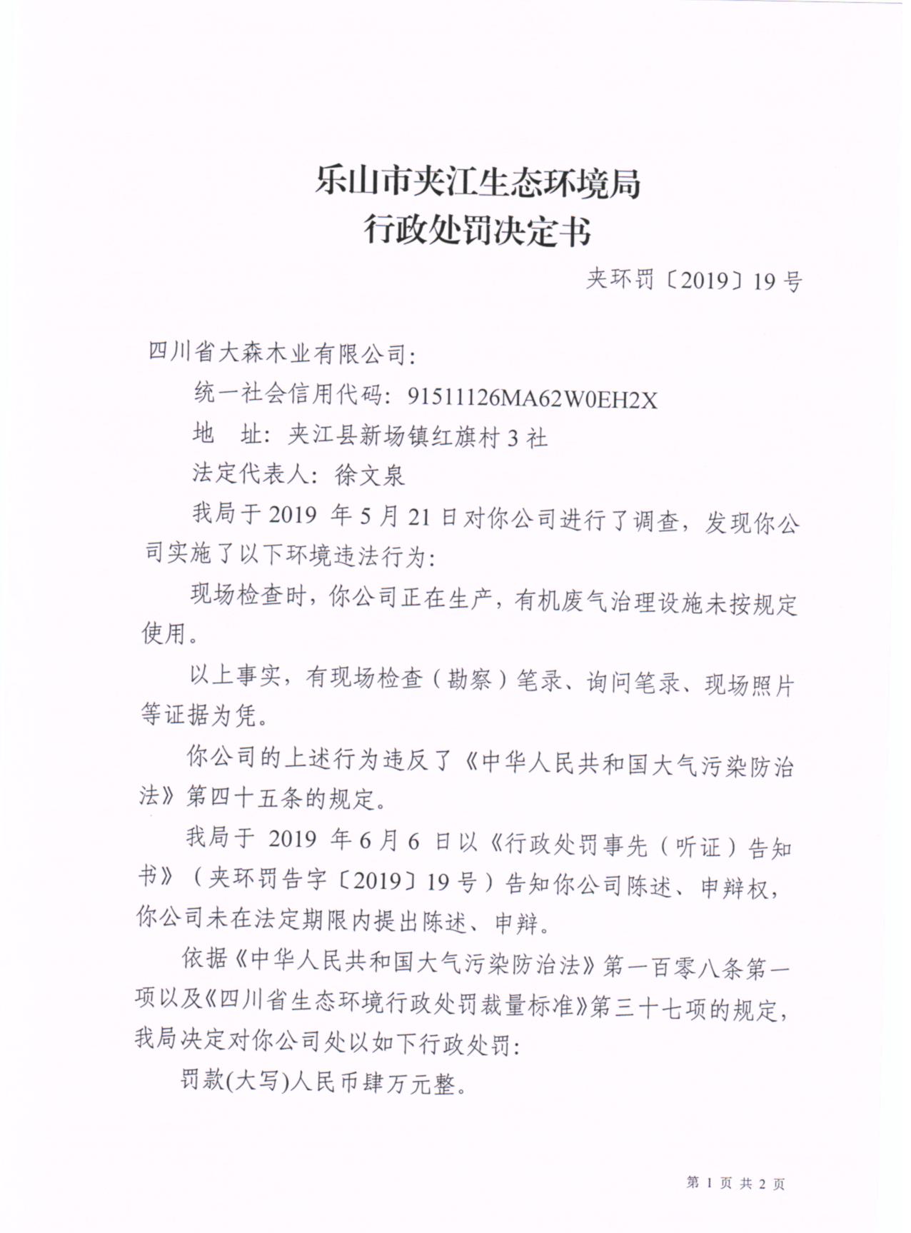 四川省大森木业有限公司行政处罚决定书