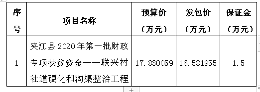 根据夹江县农业农村局关于印发《夹江县2020年第一批财政专项扶贫资金项目实施方案》的通知(夹农发[2020]11号),夹江县木城镇人民政府、夹江县木城镇联兴村村委会拟对(项目名称:夹江县2020年第一批财政专项扶贫资金——联兴村社道硬化和沟渠整治工程)进行随机抽取,欢迎符合条件的潜在申请人参与竞标。