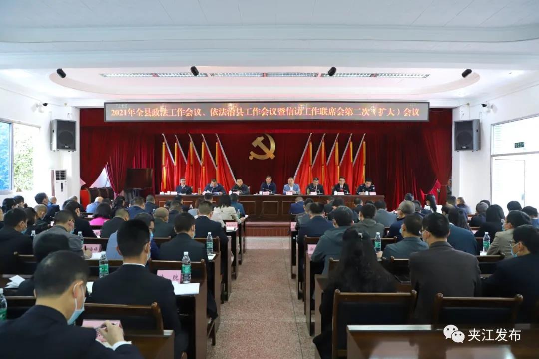 4月12日,夹江县2021年县委政法工作会议、县委依法治县工作会议暨全县信访工作联席会第二次(扩大)会议在县委礼堂召开。表扬2020年“平安夹江”和法治环境建设“四项承诺”先进单位和先进个人,传达中央、省委、市委2021年政法工作会议和市委依法治市工作会议精神,安排部署2021年全县政法工作、依法治县工作和信访工作。