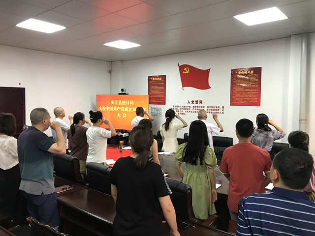 在庆祝中国共产党成立101周年之际,为激发全局党员干部爱党爱国热情,进一步坚定信念,团结奋进,勇挑重担,以更加昂扬的姿态喜迎党的二十大召开。7月1日,夹江县统计局举行庆祝中国共产党成立101周年大会,大会共分为三个板块:重温入党誓词、表彰先进、专题党课。